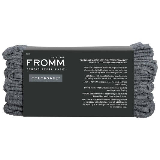 Fromm ColorSafe 100% Cotton Bleach Proof Salon Hair Towels for Hairstylists, Barbers, Spa, Gym in Grey, 16" by 29", 6 Count Absorbent Stain Resistant Towels for Drying Curly, Long, Wavy Hair