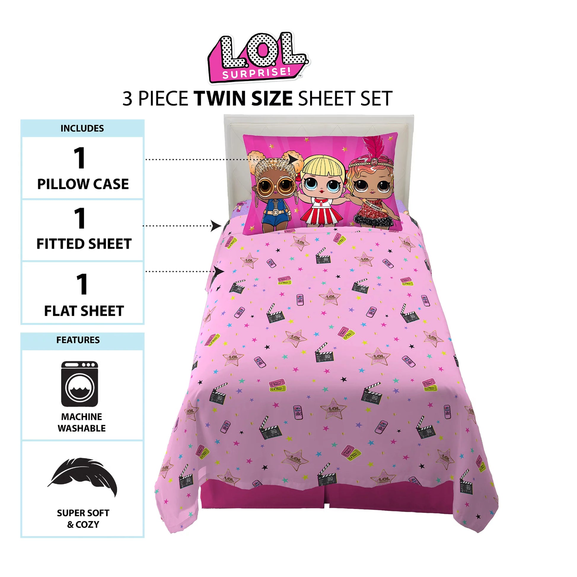 - ★ L.O.L. SURPRISE! DESIGN: Give her bedroom a musical remix with this colorful sheet set featuring the adorable L.O.L. Surprise dolls Diva, Oops Baby, MCNYC, Fierce , DJ, Twang and Supa Star from the popular doll collections.