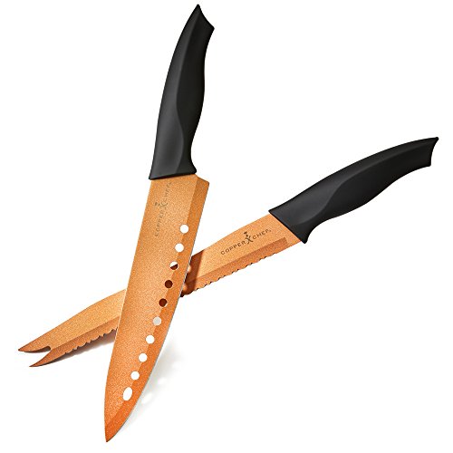 Details: As Seen On TV Copper Chef Knife Set contains an 8” professional chef knife and 9” multi-purpose slicer that ensures quick and simple cutting, minimizing food prep time. Professional Chef Knife features a comfort handle guaranteeing a secure grip and forked tip for added convenience. Multi-Purpose Slicer is equipped with a super sharp, stainless steel blade plus includes a dial cutting design easily cutting through even the toughest of foods.