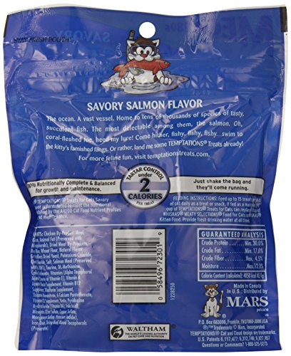 Details: Whiskas Mega Temptations treats pack savory salmon flavor in bite sized morsels. The tasty treats have a crunchy outside shell and a delectable soft center. No artificial flavors. 100% nutritionally complete. Only 3 calories in each bite.